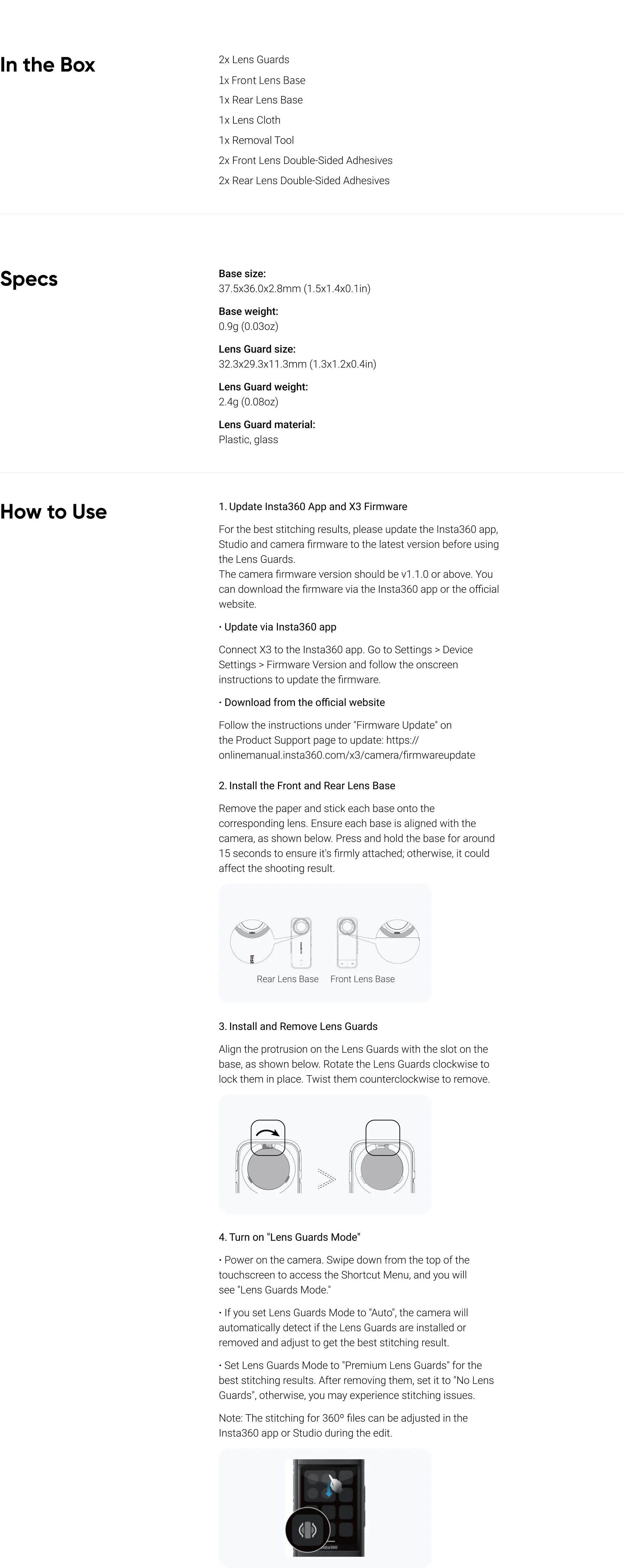- When installing or removing the Lens Guards, adjust Lens Guards Mode in settings for the most accurate stitching.