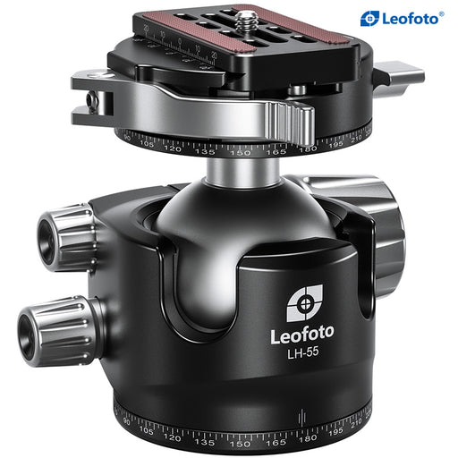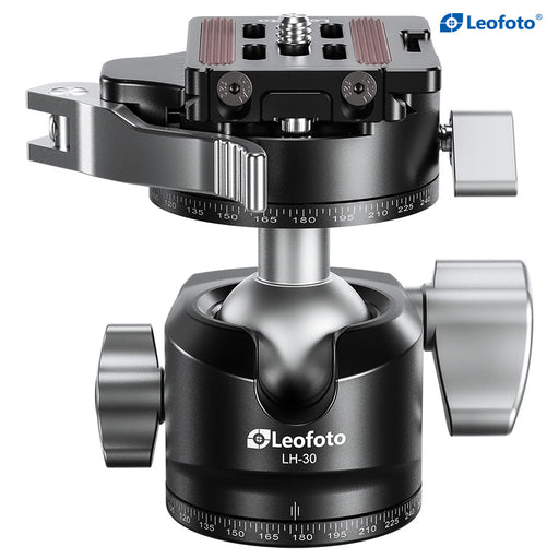 The Leofoto LH-40PCL 40mm Low Profile Dual Panorama Ball Head is a robust and meticulously engineered tool designed for professional photographers and serious enthusiasts alike. Its standout feature is the low-height profile, which enhances stability and reliability during use. The ergonomic design, including a large main locking knob, ensures easy handling and secure adjustments.