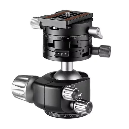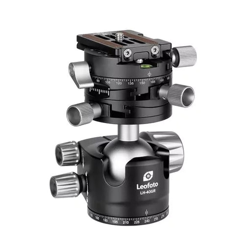 The LH-40PCL features a laser-engraved scale on the panning base, which is crucial for achieving accurate and consistent panoramic shots. This ball head is compatible with Arca-Swiss style quick-release plates, ensuring a secure and quick attachment of your camera. The inclusion of a bubble level and distance markings further aids in precise alignment and composition.