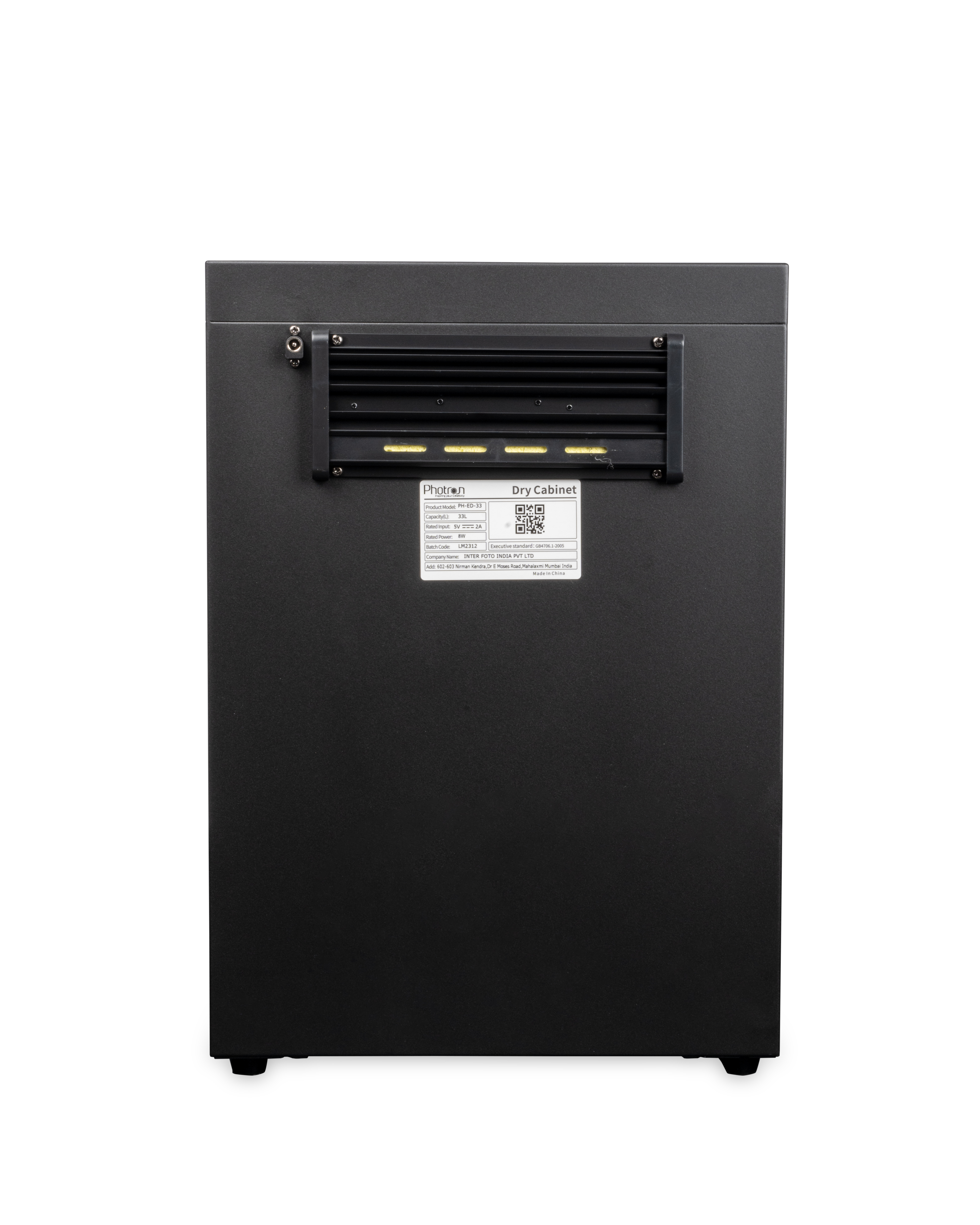 The Electronic Dry Cabinet is powered by an included multi-voltage power supply. In addition to being near silent, without a fan or compressor to make noise, the unit is also dripless, eliminating the need for a water tray. To prevent unwanted movement, the bottom of the cabinet has four rubber feet and two are levelling feet for installing on uneven surfaces.