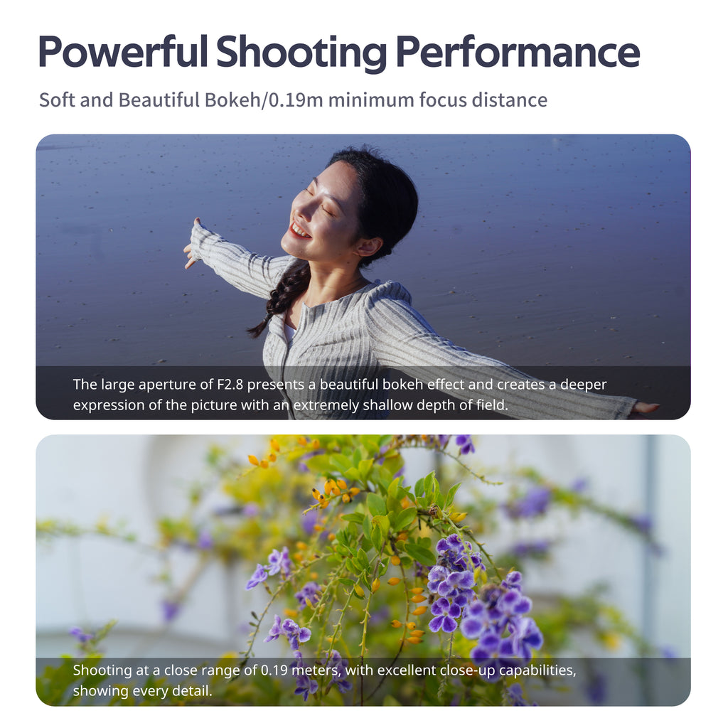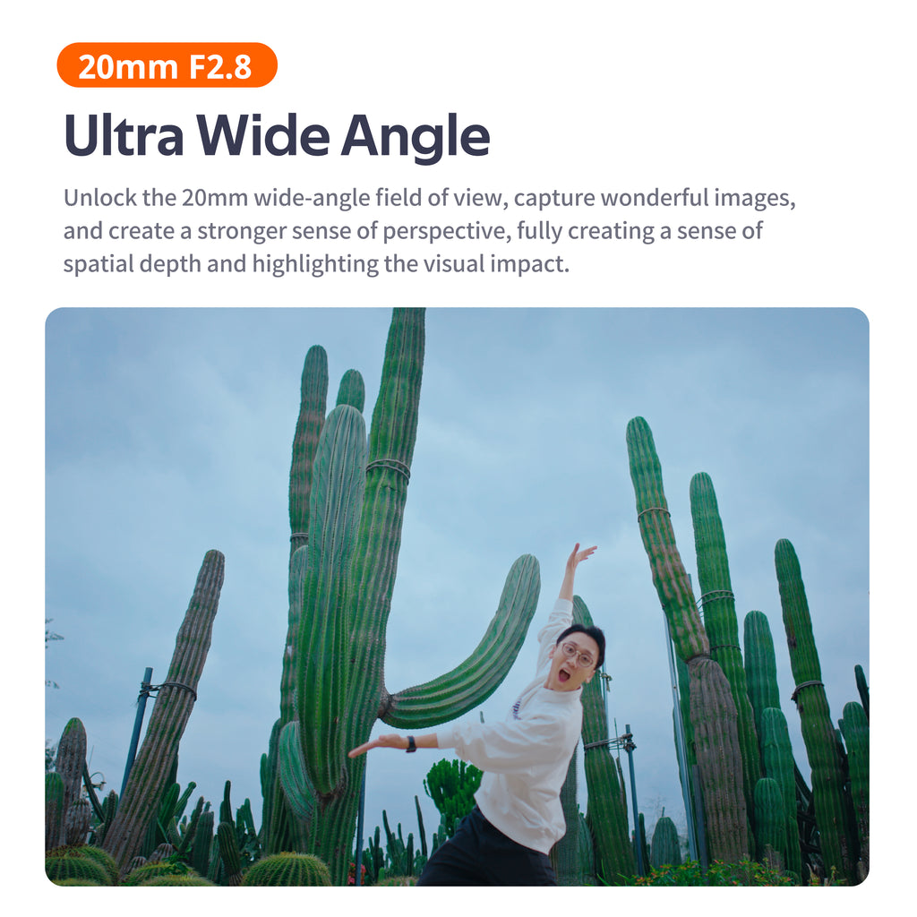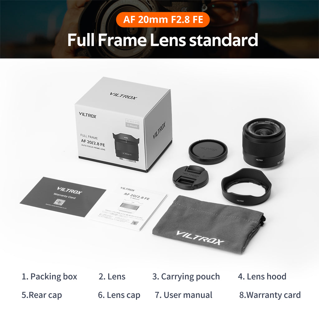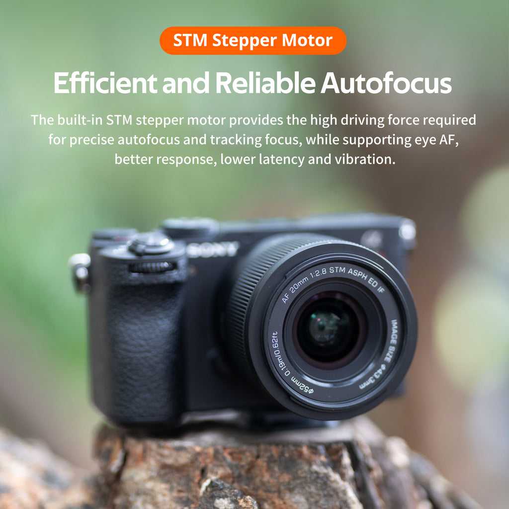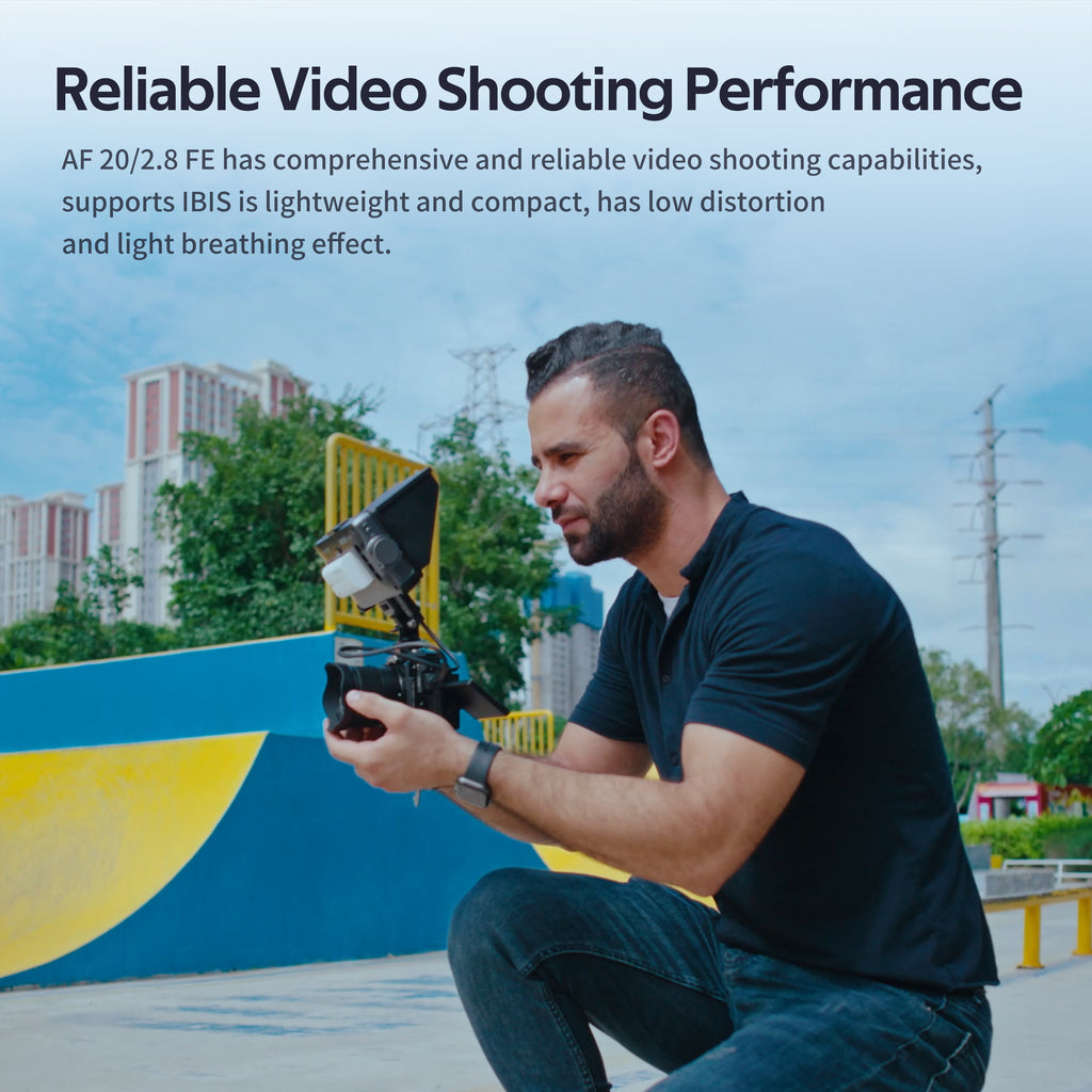 Viltrox AF 20 / 2.8 FE is an auto focus lens designed for Sony E-mount camera models. With 10 elements in 8 groups, it features outstanding optical performance. The minimum focus distance about 0.19m produces nice close-up shots. And the quiet STM focus motor can accurately control the moving position and bring accurate and smooth focusing. Great choice for portrait, landscape, close-ups and vlog shooting!